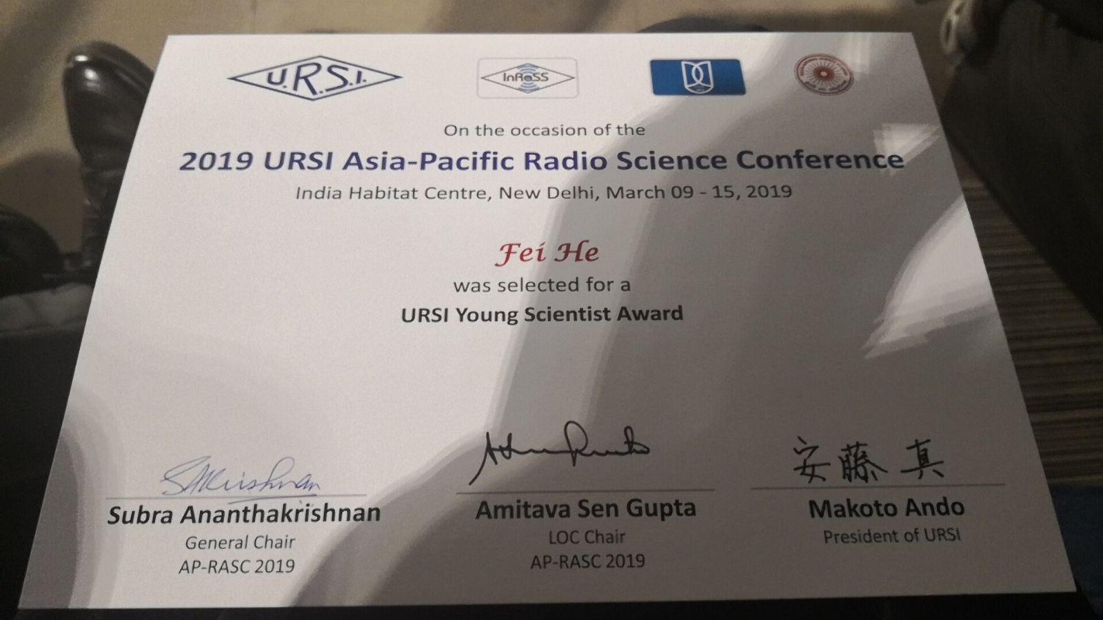 2019年3月9日至15日,2019 URSI Asia-Pacific Radio Science Conference (AP-RASC 2019) 在印度新德里召開。在本次會議上,我室何飛副研究員榮獲國際無線電科學(xué)聯(lián)盟(URSI)青年科學(xué)家獎。