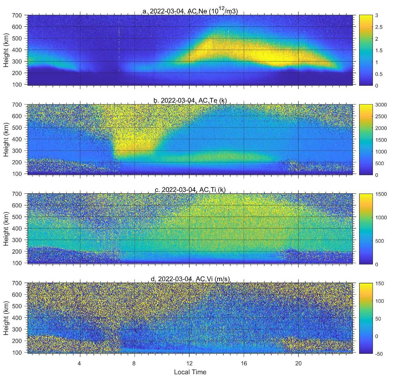 圖4. 三亞非相干散射雷達(dá)在一天中觀測(cè)得到的電離層電子密度、電子離子溫度和離子視線速度隨高度和時(shí)間變化圖。