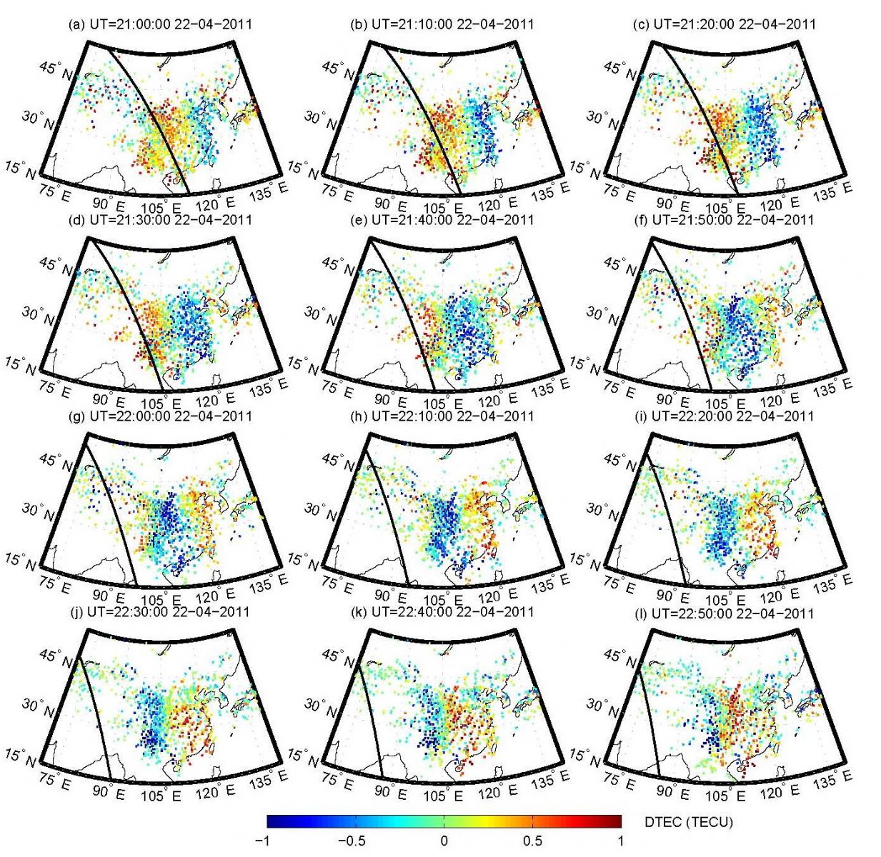 圖1. 2011年4月22日中國地區(qū)由日出線引起的大尺度電離層擾動的二維TEC地圖,黑色虛線代表日出線的分布。