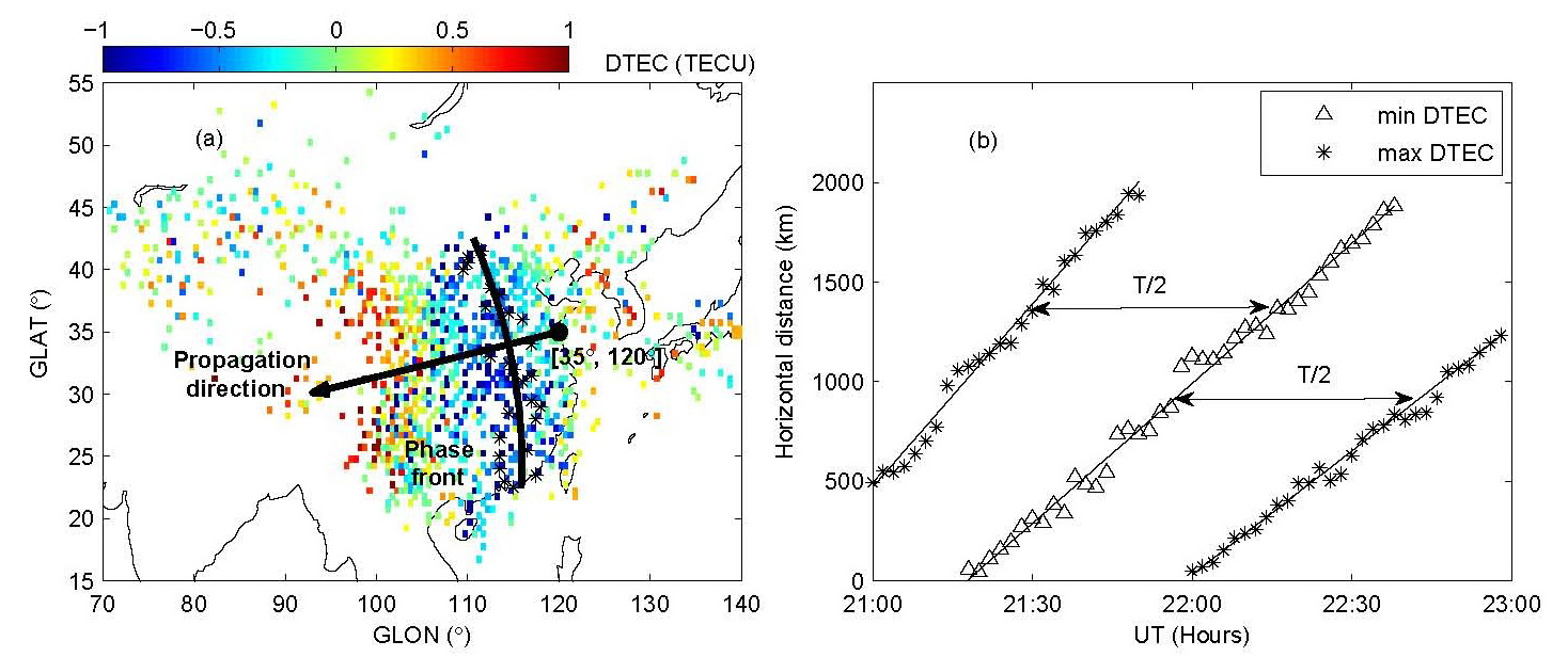 以往的研究表明,大尺度電離層行擾主要發(fā)生在強(qiáng)烈的地磁活動期間。盡管其他一些強(qiáng)烈的氣象活動以及地震、海嘯和火上爆發(fā)等也都有可能激發(fā)大尺度電離層行擾,但是這些事件都是偶發(fā)性的。而日夜交替線卻是一個穩(wěn)定重復(fù)的過程,因此這也為統(tǒng)計分析大尺度電離層行擾的傳播特性提供了一個天然平臺。