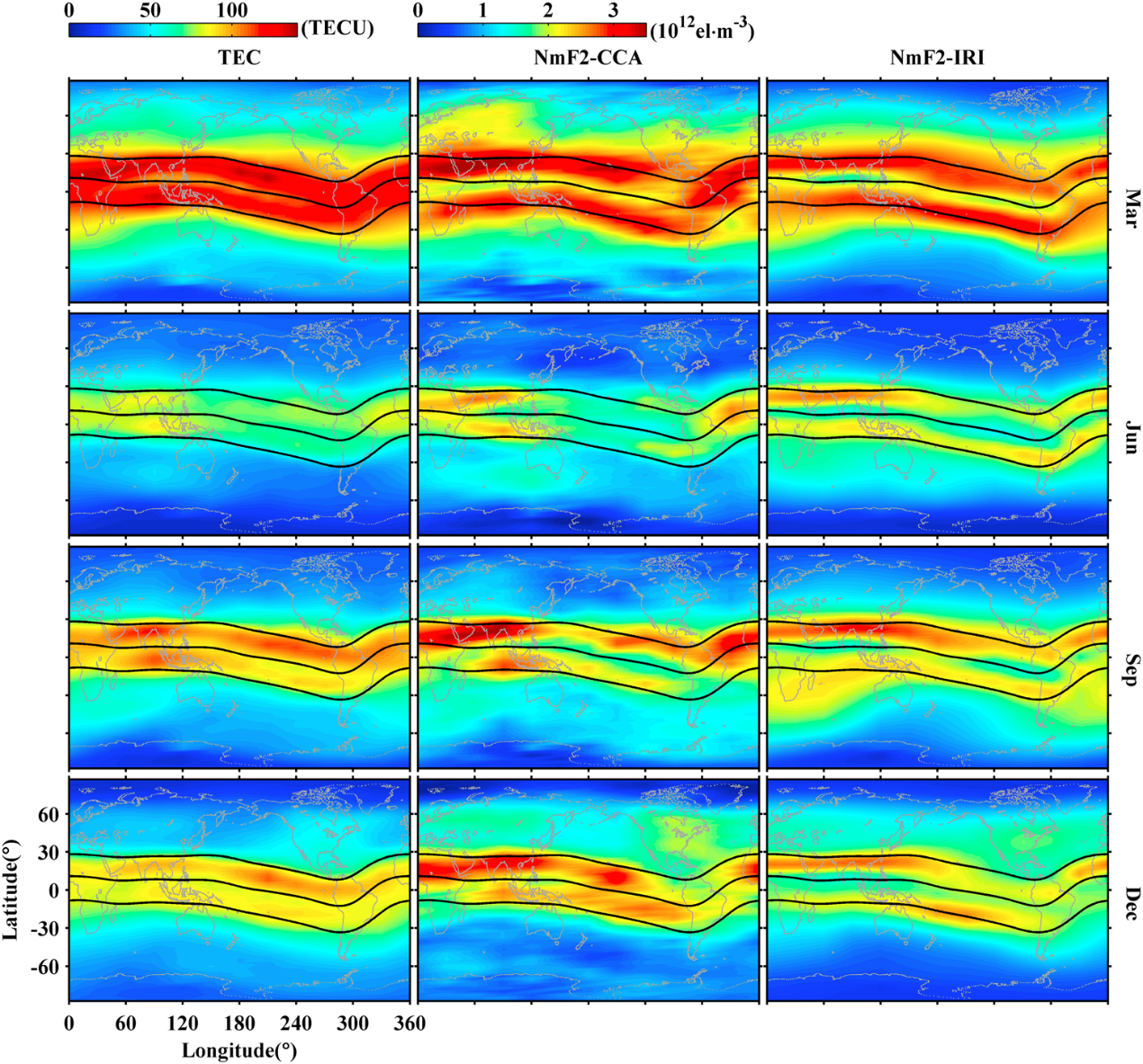 圖1. 2000年3月(第一行)、6月(第二行)、9月(第三行)和12月(第四行)14:00 LT JPL全球電離層TEC地圖(左列)、CCA構(gòu)建的NmF2地圖(第二列)和IRI07模式結(jié)果。