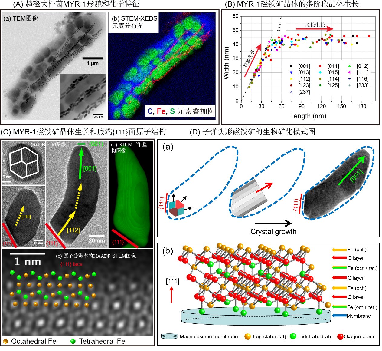 磁小體的礦化和磁學(xué)是趨磁細(xì)菌研究的核心科學(xué)問題。針對(duì)磁小體合成的無機(jī)過程及由此產(chǎn)生的復(fù)雜磁性機(jī)制,中國科學(xué)院地質(zhì)與地球物理研究所,地球與行星物理重點(diǎn)實(shí)驗(yàn)室潘永信課題組的李金華副研究員與法國合作者Nicolas Menguy教授等,利用先進(jìn)的透射電鏡技術(shù),從微米到原子尺度上系統(tǒng)研究了他們?cè)诿茉扑畮彀l(fā)現(xiàn)的趨磁大桿菌MYR-1(最近被命名為CandidatusMagnetobacterium casensis)的細(xì)胞形態(tài)、結(jié)構(gòu)和化學(xué)組成及其磁小體的晶體生長(zhǎng)和微磁結(jié)構(gòu),發(fā)現(xiàn)了子彈頭形磁小體的"多階段晶體生長(zhǎng)"規(guī)律, 并提出了硝化螺菌門趨磁細(xì)菌的生物礦化模型(圖1):磁小體膜上一些特殊的蛋白質(zhì)可能識(shí)別磁鐵礦晶體的一個(gè){111}面(該面由八面體(Feoct)和四面體(Fetet)的鐵原子混合構(gòu)成),推測(cè)功能基團(tuán)(可能為酸性氨基酸的羧基)與該面上的鐵原子結(jié)合后,作為生長(zhǎng)基面,控制磁鐵礦晶體成核和生長(zhǎng)。顆粒生長(zhǎng)初期,受磁小體膜的空間限制相對(duì)較小,容易進(jìn)行各向同性生長(zhǎng),形成立方-八面體磁鐵礦。隨著顆粒增大,磁小體膜對(duì)晶體生長(zhǎng)約束加強(qiáng),控制各向異性生長(zhǎng)。具體來講,先沿磁鐵礦晶體的一個(gè)方向拉長(zhǎng)(如[111]、[112]、[113]、[114]或[115],甚至[001])到一定尺寸(~60-80 nm)后,更換拉長(zhǎng)方向,統(tǒng)一沿[001]方向生長(zhǎng)。拉長(zhǎng)方向的改變可能與磁小體膜的形狀或鐵離子通道在磁小體膜上的不對(duì)稱分布有關(guān)。這種趨磁細(xì)菌特有的生物控制機(jī)制提示,"子彈頭形磁小體及其[001]晶體拉長(zhǎng)"可能是可靠的化石磁小體判據(jù)。
