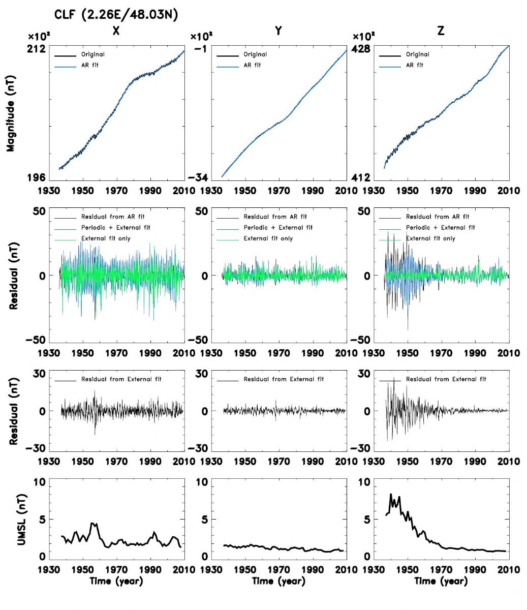 該工作發(fā)表在:Jiaming Ou, Nicolas Gillet, Aimin Du, Geomagnetic observatory monthly series, 1930 to 2010: empirical analysis and unmodeled signal estimation, Earth Planets and Space, 2015, 67 (1): 1-20.