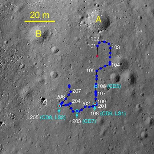 圖1 嫦娥三號著陸區(qū)和玉兔號月球車探測軌跡。