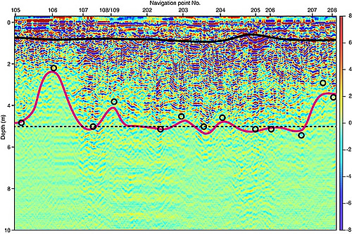 黑色粗線為上層細粒"月塵"層底界,紅色曲線為月壤的底界面,空心圓點為時頻分析給出的月壤與基巖分界點。虛線為5米深度。