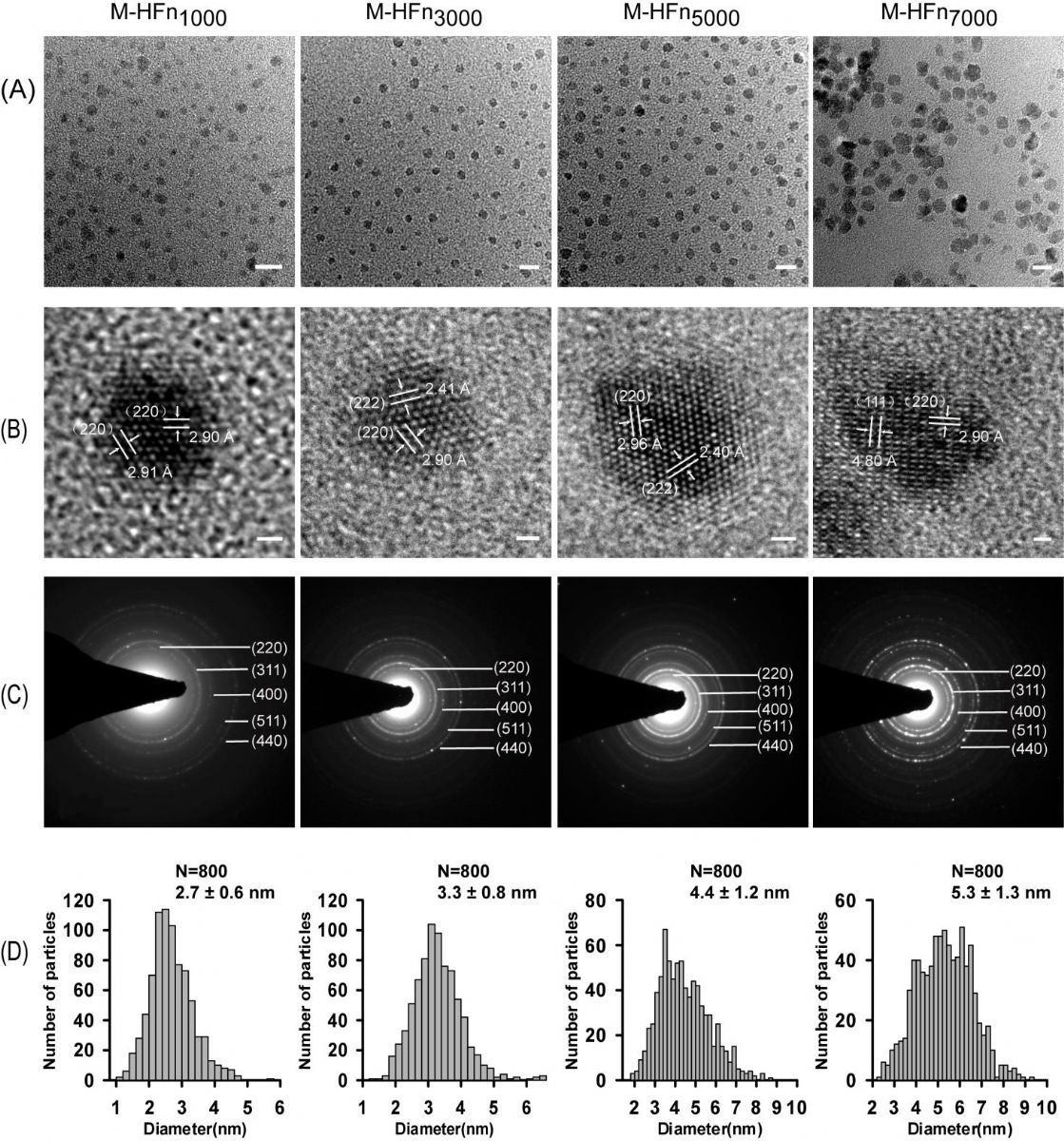 圖1:合成的人源H亞基磁性鐵蛋白納米顆粒的電子顯微學分析結果. (A)低倍透射電子顯微圖,顯示良好單分散性(比例尺:10 nm);(B)磁鐵礦晶體核的高分辨透射電子顯微圖(比例尺:1 nm);(C) 選區(qū)電子衍射圖;(D) 粒徑統(tǒng)計直方圖。
