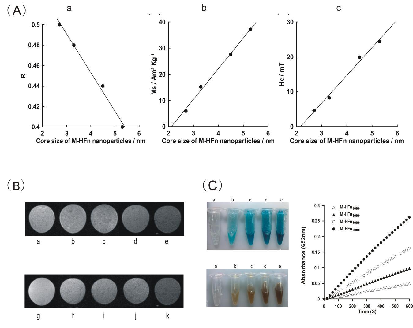 圖2:(A) M-HFn的尺寸與靜磁相互作用R值、飽和磁化強度Ms、以及矯頑力Hc之間的關系;(B)用不同粒徑的M-HFn孵育MDA-MB-231腫瘤細胞后的T2磁共振成像,(g)-(k)為粒徑5.3nm M-HFn孵育不同濃度腫瘤細胞后磁共振成像;(C)不同粒徑的M-HFn過氧化物酶活性分析,藍色和棕色分別是TMB和DAB底物顯色結果。在(B)和(C)圖中,(a)-(e)分別代表對照,M-HFn1000,M-HFn3000,M-HFn5000,M-HFn7000樣品的腫瘤細胞MRI和催化底物顯色結果。