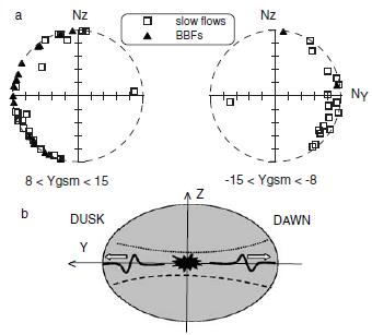 太陽風(fēng)與地磁場的相互作用使得地球背陽面磁層被拉伸形成磁尾。磁尾由磁場方向互為反平行的兩個(gè)尾瓣組成。在兩個(gè)尾瓣之間磁場反向過渡的區(qū)域,磁場較弱,電流密度較大,一般稱之為磁尾電流片。磁尾儲存了磁層的大部分磁能,儲存的磁能通過各種動力學(xué)活動,譬如磁重聯(lián),不穩(wěn)定性等,在磁尾電流片中以等離子體高速流、波動等形式轉(zhuǎn)化釋放出來,從而造成地面地磁場擾動,并伴隨極光活動的產(chǎn)生。多年來對地球磁尾電流片的觀測表明,電流片存在拍動現(xiàn)象,表現(xiàn)為衛(wèi)星多次穿越電流片,并且拍動能形成波動從午夜向磁尾兩側(cè)傳播,如圖1所示。當(dāng)前對電流片拍動形成的物理機(jī)制還不清楚。