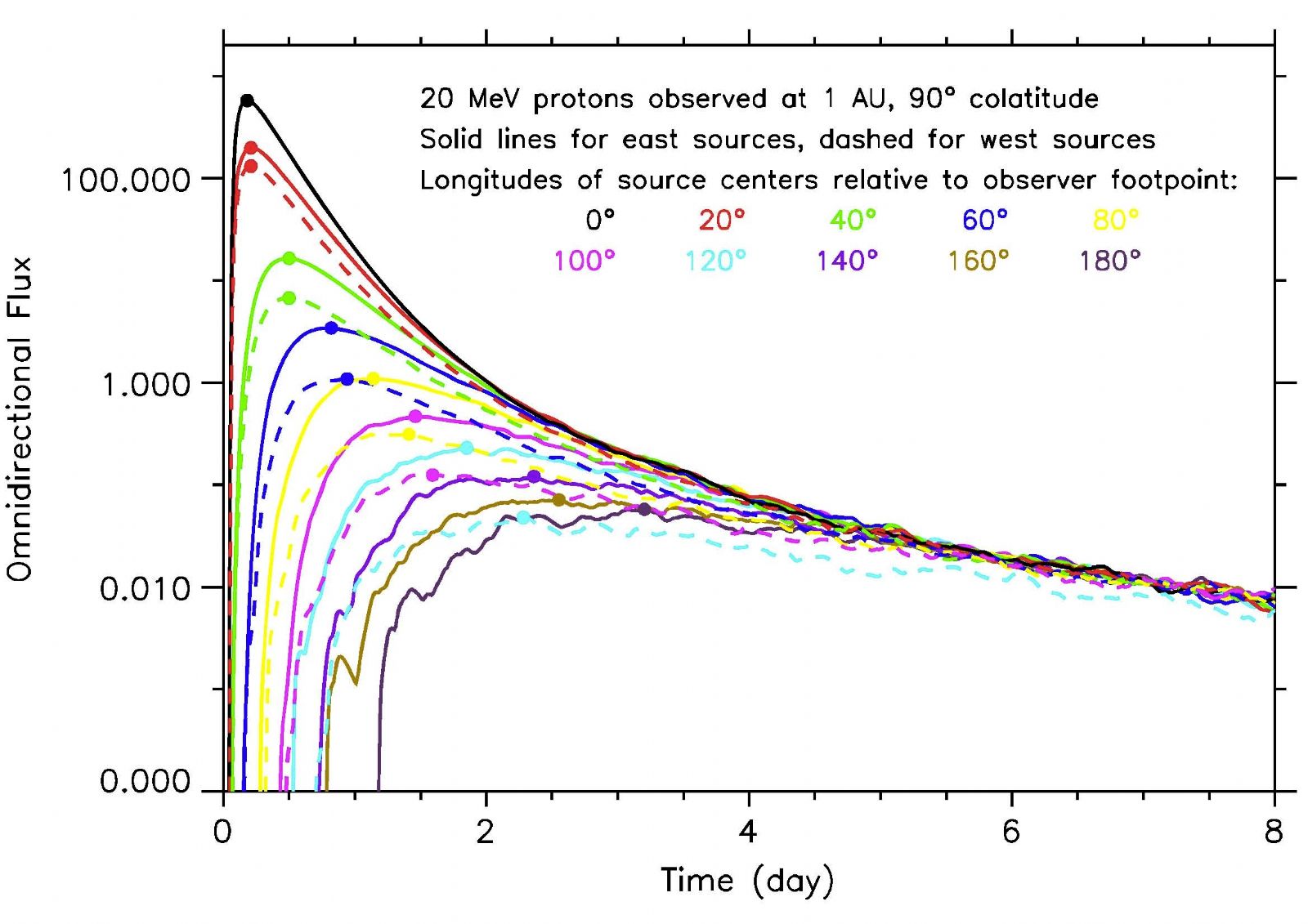 圖1:源自日面不同經(jīng)度位置的太陽高能粒子事件在地球附近的通量-時(shí)間剖面,呈現(xiàn)東(實(shí)線)-西(虛線)"相對經(jīng)度"非對稱分布現(xiàn)象。