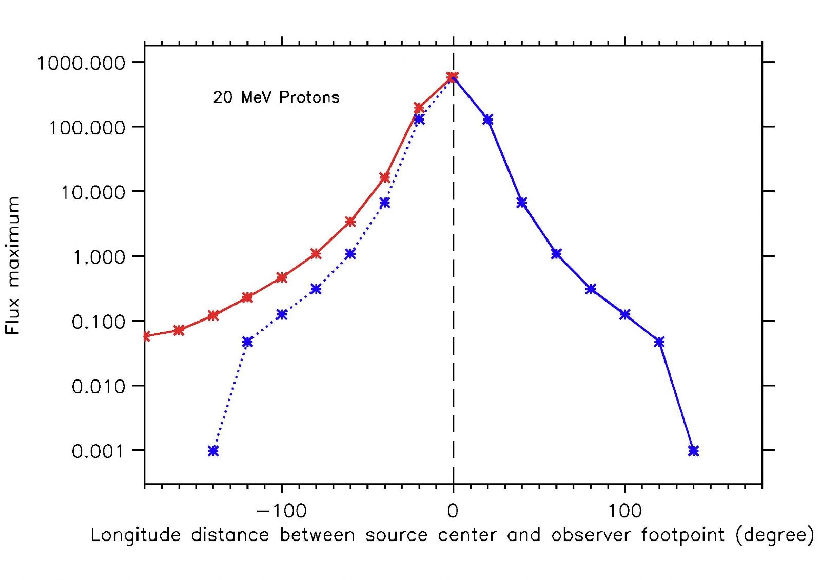 圖2:源自日面不同經(jīng)度位置的太陽高能粒子事件在地球附近的峰值通量,呈現(xiàn)系統(tǒng)性的東(左側(cè)紅線)-西(右側(cè)藍(lán)線)"相對經(jīng)度"非對稱分布現(xiàn)象。