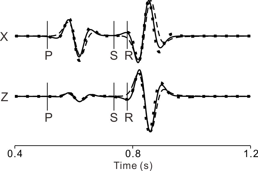 圖1 該方法不同離散網(wǎng)格間距(大網(wǎng)格和小網(wǎng)格分別用虛線(xiàn)和點(diǎn)線(xiàn)表示)時(shí)計(jì)算的地震波形與解析解(實(shí)線(xiàn))的比較。X和Z分別代表地震波場(chǎng)的水平分量和垂直分量,P, S, R分別代表P波、S波和Rayleigh波的到時(shí)。