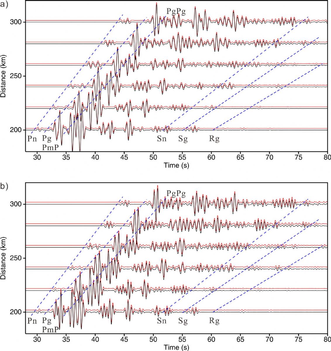 圖2 該方法8階算子長(zhǎng)度(黑線(xiàn))和經(jīng)典交錯(cuò)網(wǎng)格有限差分方法16階算子長(zhǎng)度(紅線(xiàn))合成的理論地震圖。上圖為水平分量,下圖為垂直分量。圖中藍(lán)色虛線(xiàn)給出了相應(yīng)地震相(Pn, Pg, PmP, Sn, Sg, Rg, PgPg)的參考到時(shí)。