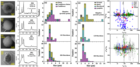 圖2 清鎮(zhèn)隕石中太陽系外石墨顆粒表現(xiàn)為洋蔥型(Onion)、洋蔥-花椰菜型(Onion-cauliflower)與花椰菜型(Cauliflower)的形貌以及disordered、glassy和kerogen型的拉曼光譜;并與碳質(zhì)球粒中的顆粒在形貌、結(jié)晶程度、以及C、O和Si等同位素組成上進(jìn)行對(duì)比,推測太陽系外石墨顆粒在太陽星云中可能均勻分布