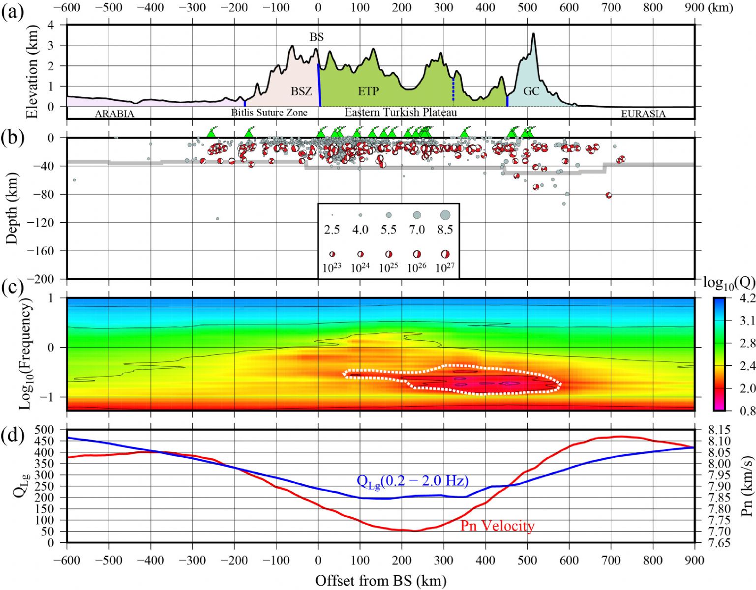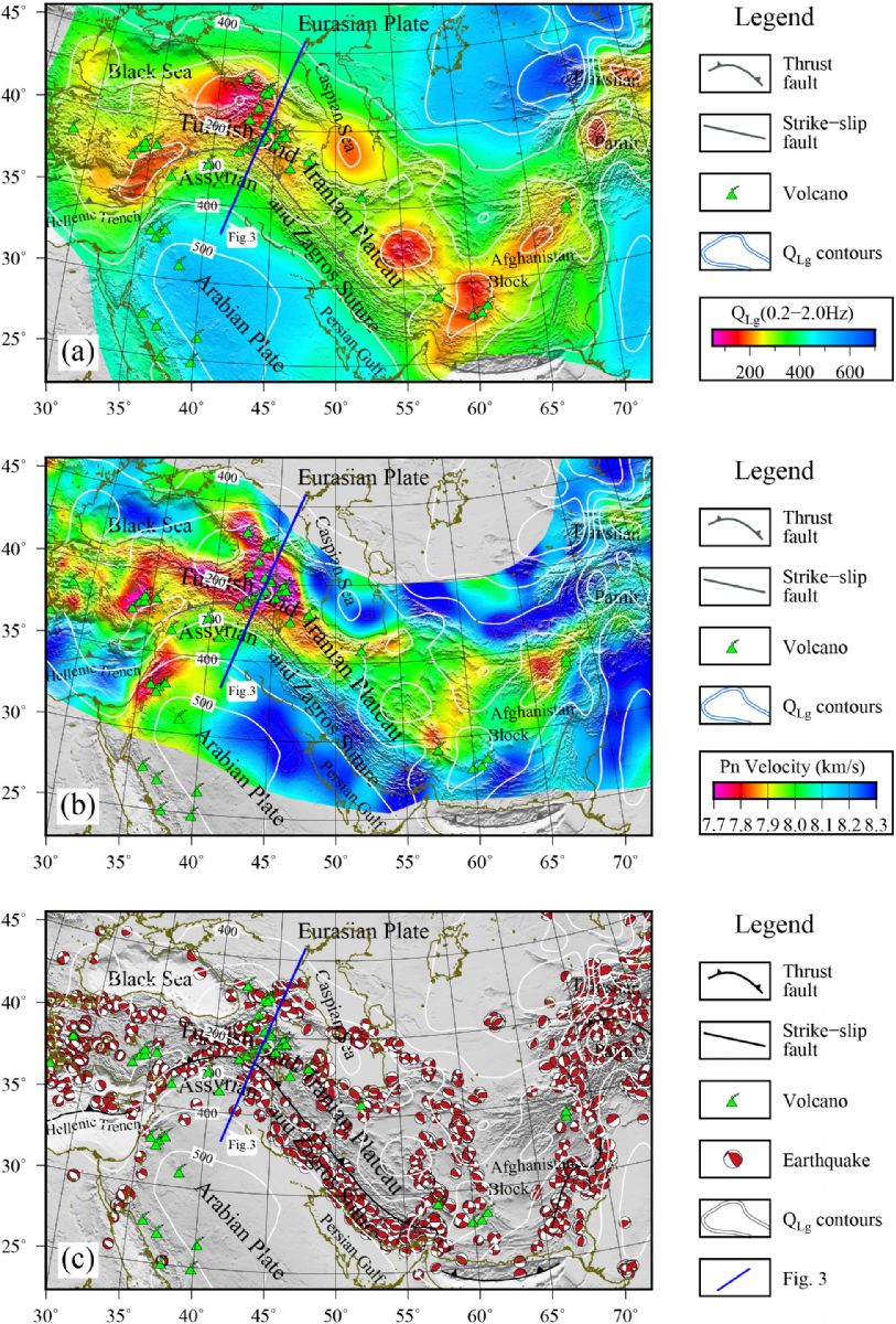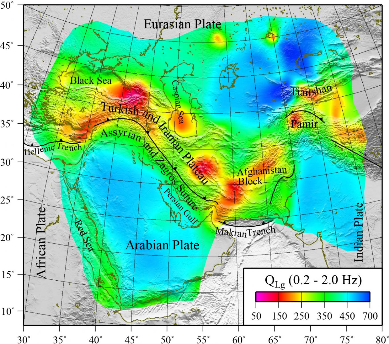 歐亞板塊、非洲板塊、阿拉伯板塊和印度板塊持續(xù)匯聚,形成土耳其-伊朗-青藏高原一線的大陸碰撞造山帶。在不同的地質(zhì)年代,陸陸碰撞作用造就安那托利亞、土耳其、伊朗、帕米爾和青藏高原。印度與歐亞板塊碰撞始于古新世至始新世中期(65-45 Ma),阿拉伯與歐亞板塊的碰撞發(fā)生在晚始新世至中新世中期(40-13 Ma),非洲板塊仍然以海洋板塊的形式在現(xiàn)今的地中海之下向歐亞板塊俯沖。大陸碰撞的構(gòu)造格局受控于三疊紀(jì)中期的古特提斯洋消亡、新特提斯洋閉合,以及后續(xù)的構(gòu)造過程。這些構(gòu)造運(yùn)動(dòng)包括海洋板塊俯沖,大尺度的轉(zhuǎn)換斷層,擠壓造山和地殼伸展等。區(qū)別于古老大陸和穩(wěn)定的地臺(tái)地區(qū),造山過程通常伴隨著劇烈的熱運(yùn)動(dòng),強(qiáng)烈影響著地殼和上地幔介質(zhì)的屬性和地質(zhì)塊體的流變學(xué)性質(zhì),并由此產(chǎn)生諸如材料流動(dòng),破碎,彈性模量改變,局部熔融等現(xiàn)象。地震波衰減的主要機(jī)制包括固有衰減和散射衰減兩部分。前者與熱激活過程直接相關(guān),后者與介質(zhì)的非均勻性,例如破碎以及局部熔融包體等的存在以及它們的尺度存在密切關(guān)系。因此,利用主要在地殼內(nèi)傳播的地震Lg波能夠探測(cè)地殼內(nèi)物質(zhì)的溫度、壓力和含水等物理狀態(tài)。