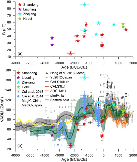 中科院地質(zhì)地球所特提斯研究中心古地磁與年代學(xué)學(xué)科組蔡書慧博士后和合作導(dǎo)師朱日祥院士、鄧成龍研究員、秦華峰副研究員、潘永信研究員及美國合作導(dǎo)師Lisa Tauxe教授、山東大學(xué)靳桂云教授等共同合作,對(duì)采自山東、遼寧、吉林、浙江、河北等中國東部地區(qū)的考古樣品開展了詳細(xì)的古強(qiáng)度研究??脊艠悠饭?/span>75塊,遺址類型包括窯址、居住遺址、墓葬等,樣品類型包括陶瓷碎片、磚、燒土、爐渣等,時(shí)代涵蓋從大汶口文化時(shí)期到元代的近六千年。他們通過嚴(yán)謹(jǐn)?shù)膹?qiáng)度實(shí)驗(yàn)和嚴(yán)格的數(shù)據(jù)篩選,最終共獲得21個(gè)可靠古強(qiáng)度結(jié)果。新增結(jié)果記錄的地磁場(chǎng)強(qiáng)度值變化范圍為~15-~86 μT,對(duì)應(yīng)的地磁場(chǎng)虛偶極矩 (VADM) 變化范圍從~27-~166 ZAm2,與中國中心位置 (35 oN,105 oE) 現(xiàn)代地磁場(chǎng)強(qiáng)度 (~53 μT (97 ZAm2)) 相比,新結(jié)果記錄到的地磁場(chǎng)最低值只有現(xiàn)代場(chǎng)的三分之一,而最高值達(dá)現(xiàn)代場(chǎng)的1.5倍。結(jié)合東亞近幾年已發(fā)表數(shù)據(jù),該研究建立了第一條東亞全新世地磁場(chǎng)強(qiáng)度變化參考曲線,可用于該區(qū)域考古定年(圖1)。研究結(jié)果記錄到的~2200 BCE-~1300 BCE之間地磁場(chǎng)強(qiáng)度從全新世范圍內(nèi)的極低值升高到極高值的極端變化,具有重要的地球動(dòng)力學(xué)指示意義。