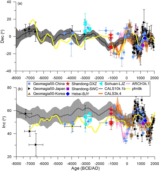 此外,另一項(xiàng)研究對(duì)采自山東濟(jì)南大辛莊遺址、山東壽光雙王城遺址、河北隆化鮑家營遺址和四川金川劉家寨遺址的定向樣品開展了詳細(xì)的考古方向研究。參與實(shí)驗(yàn)的38塊定向樣品最終有22塊獲得了可靠的方向結(jié)果。研究新獲得的數(shù)據(jù)結(jié)合中國、日本、韓國等地區(qū)已發(fā)表數(shù)據(jù)揭示出近10 ka,東亞地區(qū)地磁場(chǎng)偏角和傾角變化范圍分別為30°W-20°E和30°-70°,西向和東向漂移同時(shí)存在,但以前者為主(圖2)。該研究新增結(jié)果是自20世紀(jì)90年代以來中國第一批考古方向數(shù)據(jù),極大地補(bǔ)充了現(xiàn)有數(shù)據(jù)庫,尤其是填補(bǔ)了3 ka之前部分時(shí)間段的空白。