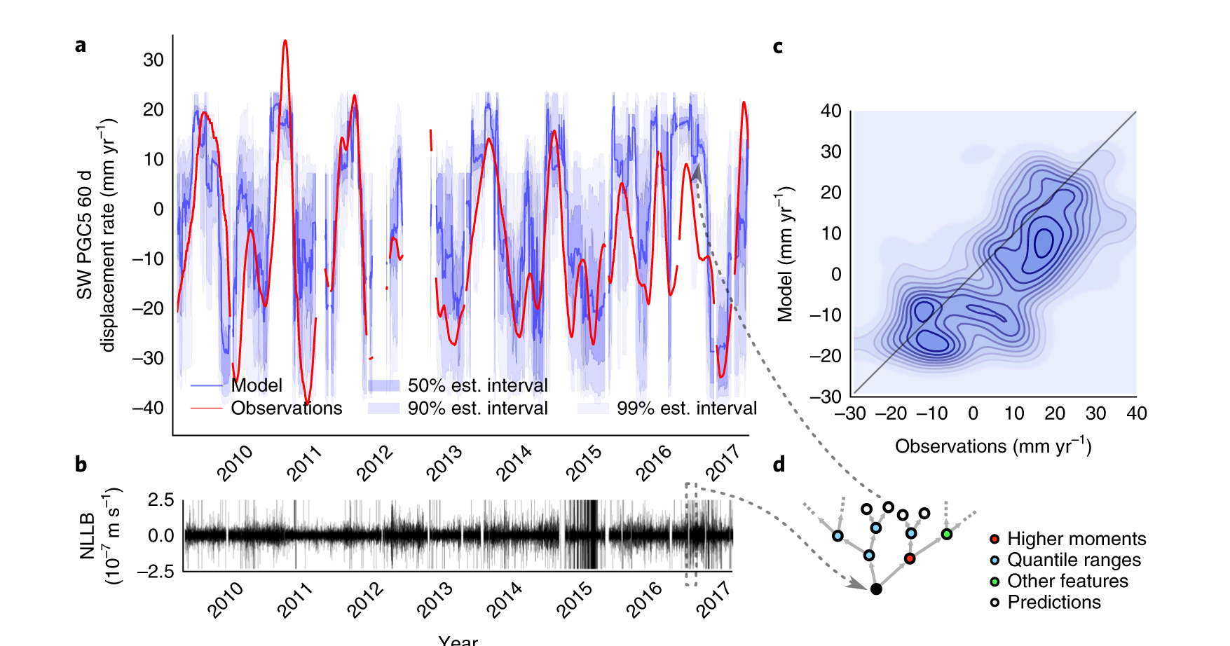 圖2 從地震信號(hào)估算GPS信號(hào)的圖示。圖a中紅色線為實(shí)際的(經(jīng)過平滑處理的)GPS數(shù)據(jù),藍(lán)色線為隨機(jī)森林方法給出的回歸值,藍(lán)色陰影為預(yù)測(cè)給出的區(qū)間;圖b為對(duì)應(yīng)的NLLB臺(tái)站的連續(xù)波形記錄;圖c為預(yù)測(cè)值與實(shí)際值的分布,其皮爾森相關(guān)系數(shù)(Pearson correlation coefficient)為0.66,說明波形記錄中包含了大量的位移速率信息;圖d為隨機(jī)森林的示意圖(Rouet-Leduc et al., 2019)