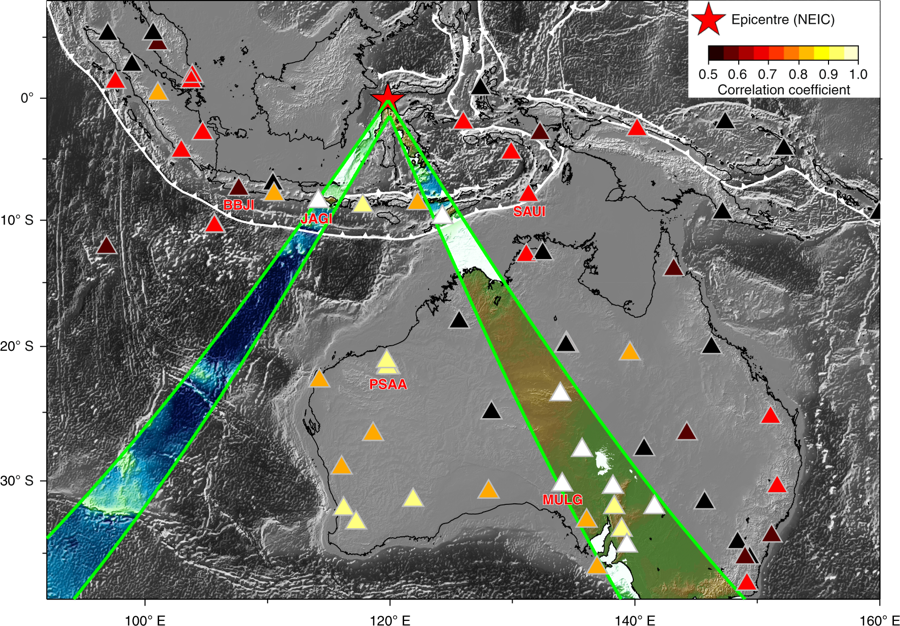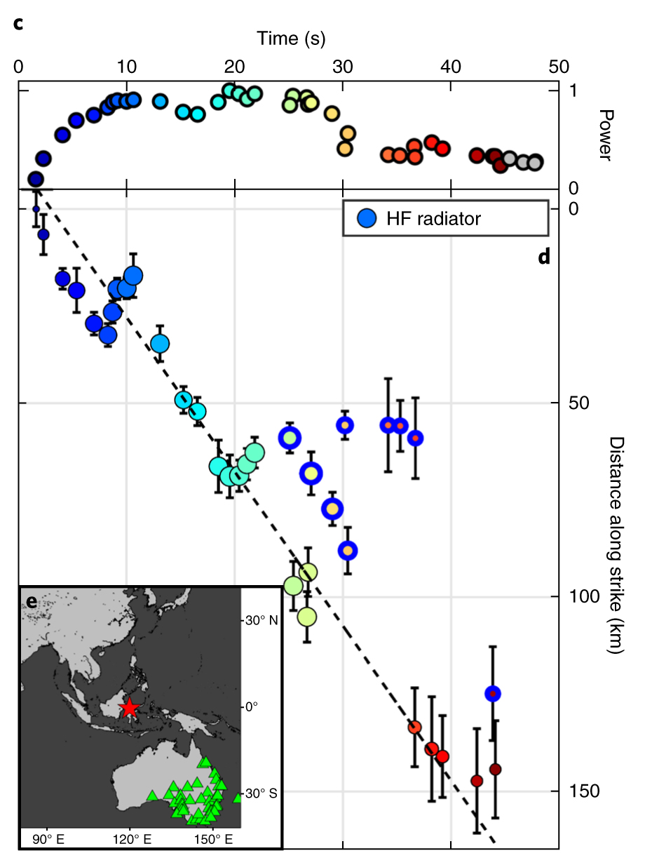 2018年9月28日,印尼帕盧發(fā)生了一次Mw7.5級走滑地震,地震引發(fā)的滑坡、液化和海嘯造成了非常嚴重的人員傷亡。帕盧地震是不是超剪切地震,其破裂特征如何?加州大學洛杉磯分校的Bao et al.(2019)在Nature Geoscience上公布了他們的研究成果。澳大利亞臺站的反投影結果(圖1c-圖1e)顯示,不同于其他超剪切破裂事件,這次地震的初始階段沒有長時間的亞剪切破裂,破裂速度快速超越了剪切波速度,且自始自終都是持續(xù)的超剪切破裂,平均破裂速度約為4.1 ± 0.15 km/s,介于Vs與Eshelby速度(