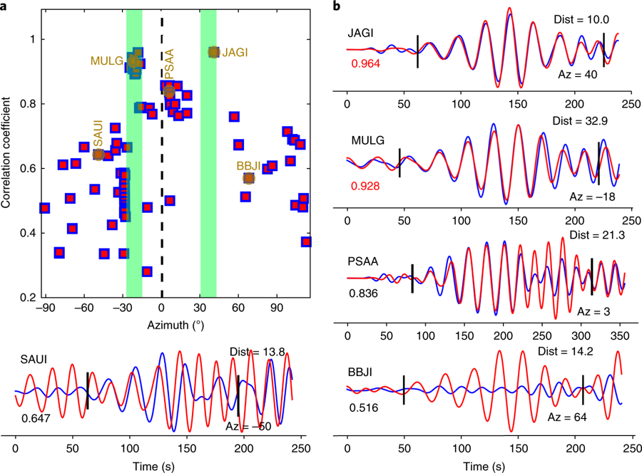 圖3 瑞利馬赫波的證據(jù)(Bao et al., 2019)。(a)主震15-25s瑞利波與其M 6.1前震波形的相關系數(shù)隨相對于破裂走向的方位角變化圖,兩個綠色條帶表示估計的馬赫錐方位角的可能范圍。(b)15-25s周期的主震(藍色)和前震(紅色)的瑞利波垂直位移記錄。前震信號通過主震/前震地震矩比(大小為125)進行縮放