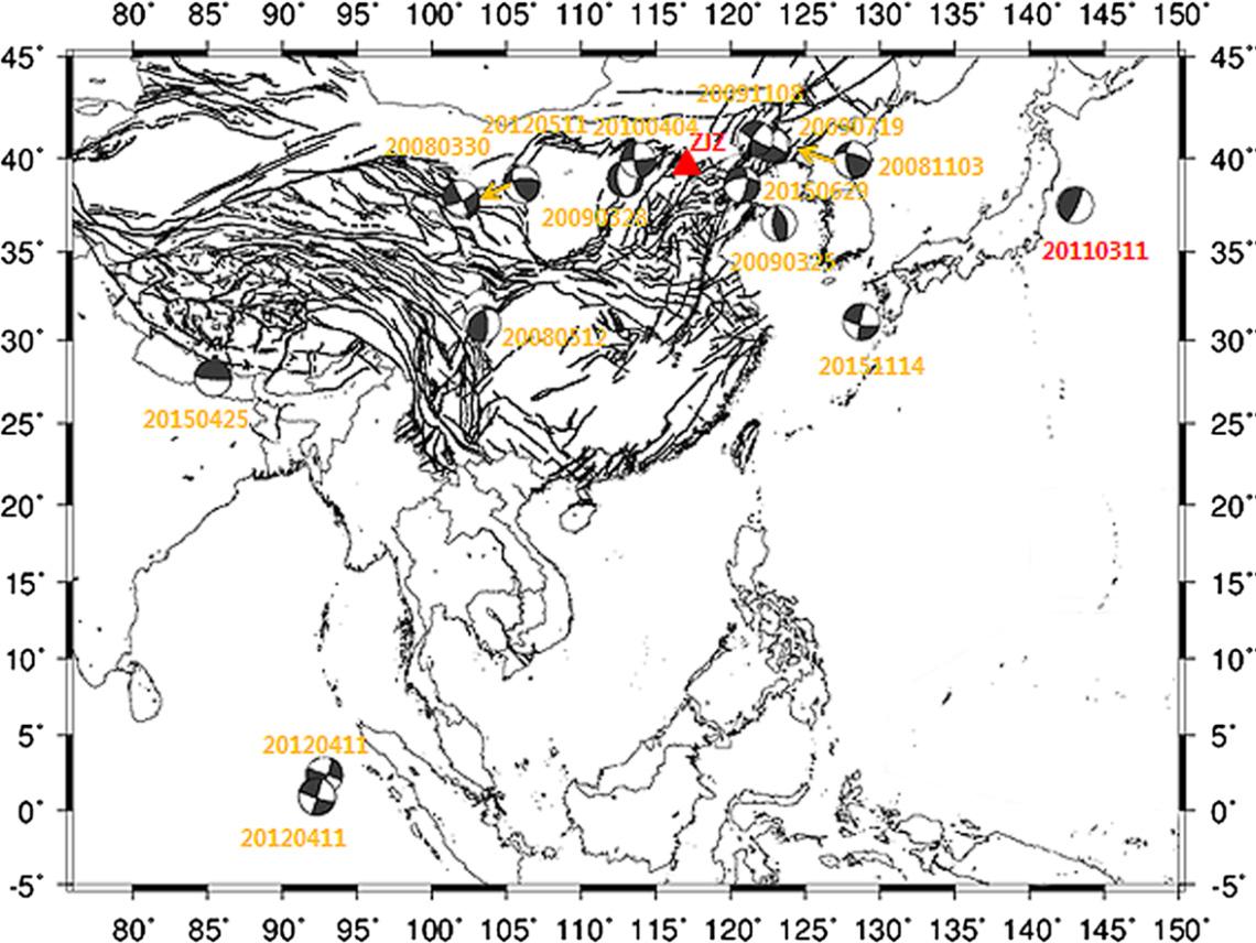圖1 左家莊井的地理位置(紅色三角形)和引起左家莊井同震水位變化的地震的震中位置(沙灘球)
