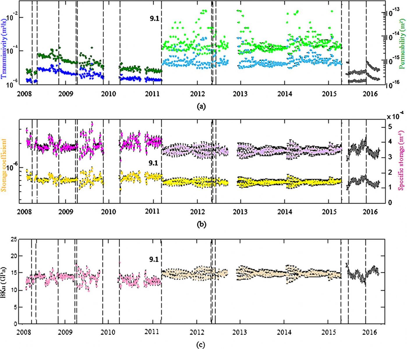 圖2 按照Hsieh的水平流模型計算所得2008年2月1日至2016年3月31日的左家莊井的(a)導水系數(shù)(藍色)和滲透率(綠色),(b)儲水系數(shù)(黃色)和儲水率(紫色),(c) BKu. 虛線表示地震發(fā)震時刻