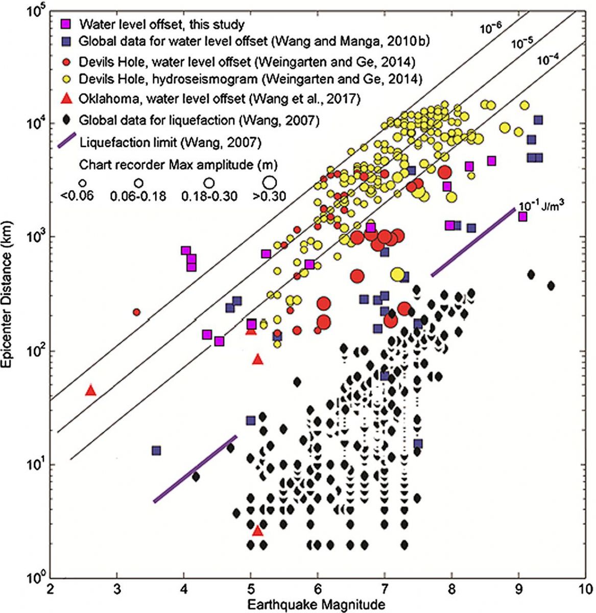 圖3 地震引起的作為地震震級和震中距函數(shù)的水力變化分布圖