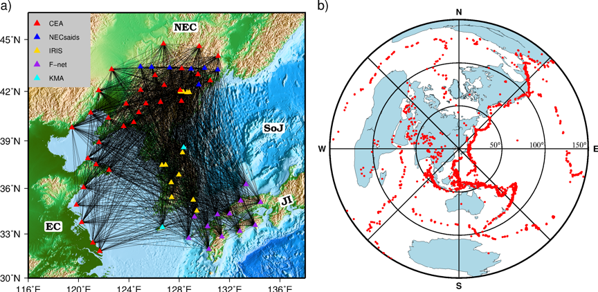 圖2(a) 是本研究中地震臺站和所有能提取頻散曲線的雙臺射線分布圖。紅色三角形表示CEA固定臺;藍色三角形表示NECsaids流動臺;黃色三角形表示IRIS地震臺;紫色三角形表示日本F-net 地震臺;青色三角形表示韓國氣象廳KMA 地震臺。(b)是本研究中挑選的2717個遠震地震事件分布圖。地震事件選取準則為震中距位于10°到150°之間、震級大于5.5以及震源深度小于50km。