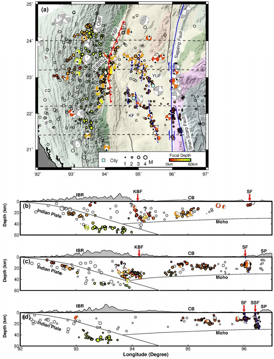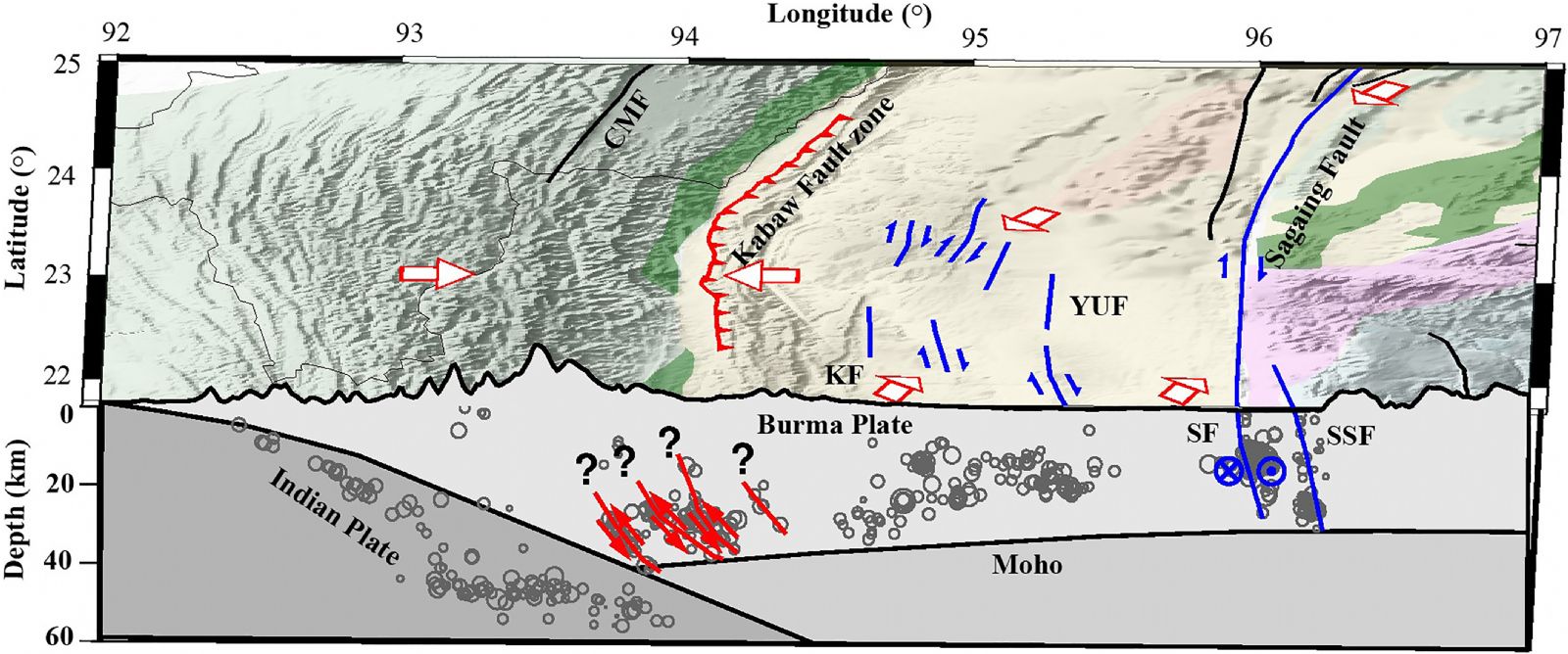 緬甸構(gòu)造上隸屬于喜馬拉雅碰撞造山帶東構(gòu)造結(jié)區(qū)域,發(fā)育有典型的板塊斜向碰撞俯沖構(gòu)造,受印度板塊在緬甸板塊之下向北運動和向東俯沖控制;構(gòu)造活躍,破壞性地震多發(fā)。前人研究表明,長達(dá)1500km的實皆(Sagaing)斷層吸收了斜向俯沖造成的絕大部分近地表變形。而最近的GPS觀測表明,近地表應(yīng)變并未集中于實皆斷裂,而呈現(xiàn)出空間彌散的特征(Mallick et al.,2019;Steckler et al.,2016),意味著緬甸區(qū)域可能存在其他未知斷層帶。對該問題的研究有助于深入理解斜向俯沖對淺部構(gòu)造變形的控制作用,并對緬甸地區(qū)地震危險性區(qū)劃與評估有重要的指導(dǎo)意義。長期以來,由于緬甸缺乏現(xiàn)代地震觀測臺站,該地區(qū)的淺表活動斷層系統(tǒng)的詳細(xì)幾何結(jié)構(gòu)和應(yīng)力狀態(tài)有待于研究確定。