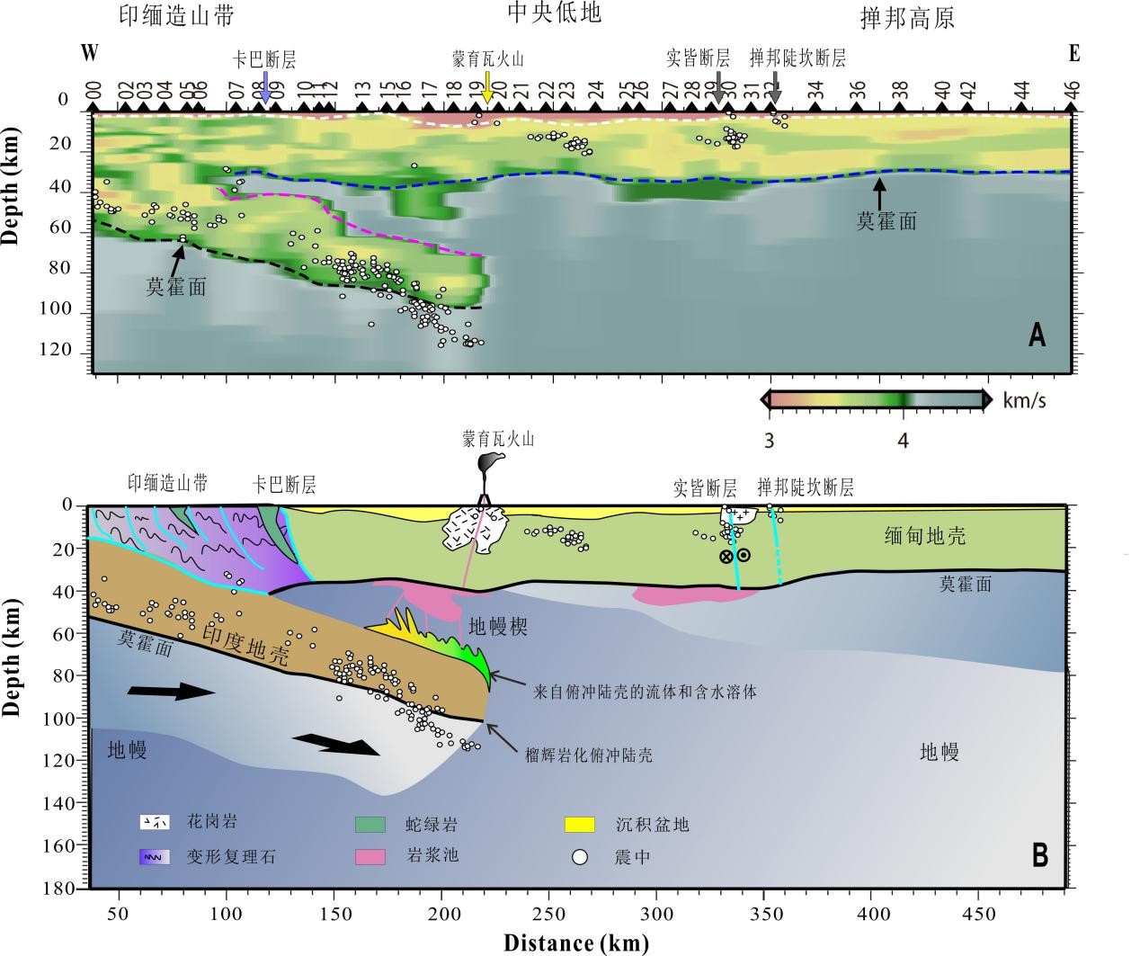 圖1 緬甸中部東西向地震觀測(cè)剖面下的地殼-上地幔速度結(jié)構(gòu)(A)和印度大陸板片東向俯沖的構(gòu)造示意圖(B)