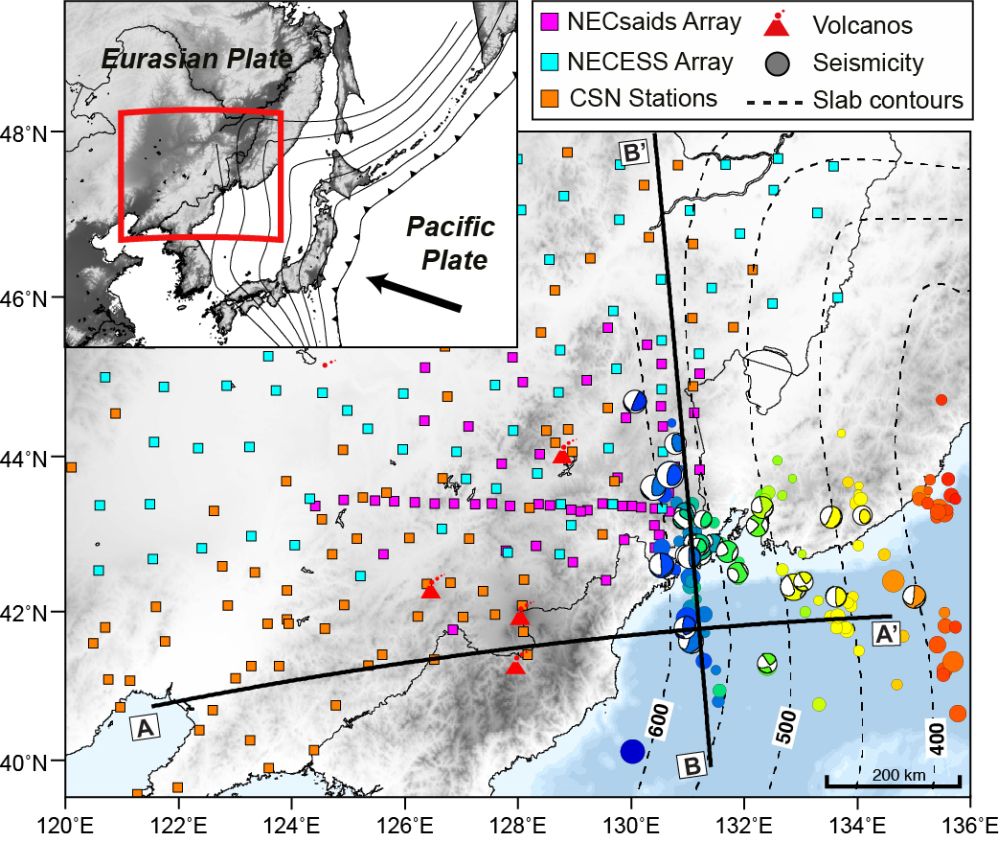 圖1 西北太平洋俯沖帶構(gòu)造簡圖。彩色方塊代表該研究中用到的地震臺站(紫色表示研究團(tuán)隊布設(shè)的NECsaids寬頻帶流動地震臺陣,藍(lán)色表示NECESSArray流動地震臺陣,橙色為國家固定臺站)。彩色圓圈表示深源地震,黑色虛線表示太平洋俯沖板片等深線。