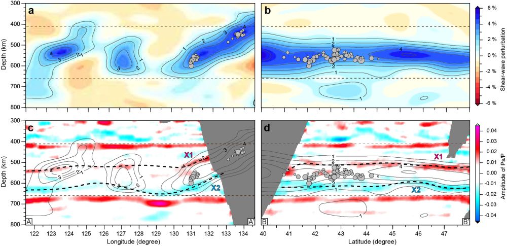 圖2 地幔過渡帶中觀測到明顯的俯沖板片上、下界面。(a-b)全波形層析成像(Tao et al., 2018)結(jié)果,其中紅色代表低速異常,藍(lán)色代表高速異常。灰色圓圈表示深源地震,黑色等值線代表與俯沖板片相關(guān)的速度異常。(c-d)接收函數(shù)共反射點(diǎn)疊加剖面,其中紅色代表低速到高速(從淺到深)的跳變,藍(lán)色代表高速到低速(從淺到深)的跳變。該研究在地幔過渡帶中觀測到明顯的俯沖板片高速體的上、下界面分別用X1、X2標(biāo)示。剖面位置見圖1。