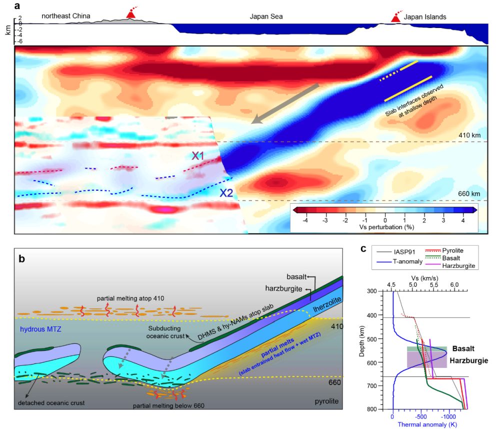 針對俯沖板片的深部界面問題,實驗室王新副研究員、陳棋福研究員、李娟研究員等,聯(lián)合美國萊斯大學(xué)、新加坡南洋理工大學(xué)地球觀測研究所、北京大學(xué)、中國地震局地震預(yù)測研究所、美國加州理工學(xué)院和伊利諾伊大學(xué)厄巴納-香檳分校等科研人員,就西北太平洋俯沖帶下方的俯沖板片精細(xì)結(jié)構(gòu)展開探測研究(圖1)。該研究在410-660 km深的地幔過渡帶內(nèi)探測到兩個尖銳且略傾斜的地震波速度不連續(xù)面,與研究區(qū)域的全波形層析成像結(jié)果以及深源地震的分布吻合較好,認(rèn)為它們分別代表了俯沖的太平洋板片高速體的上界面和下界面(圖2)。通過多頻段接收函數(shù)波形模擬,并結(jié)合巖石高溫高壓實驗和地球動力學(xué)研究結(jié)果,研究團(tuán)隊認(rèn)為俯沖板片的上界面與俯沖板片的莫霍面(洋殼、洋幔界面)相關(guān),而在地幔過渡帶含水情況下,俯沖板片下側(cè)軟流圈的部分熔融則導(dǎo)致板片的下界面清晰可辨(圖3)。