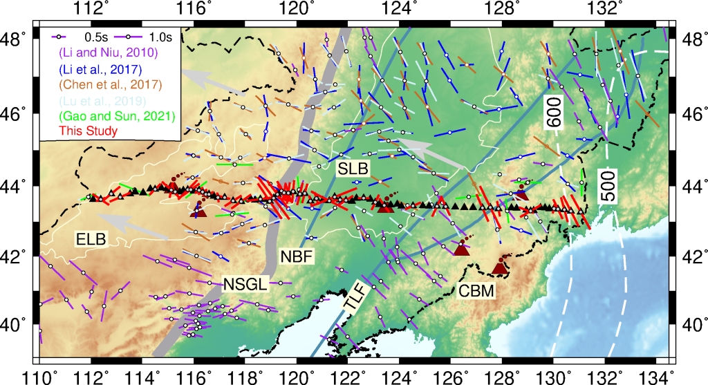 以中國東北為主體的東北亞大陸是由多個微陸塊俯沖、碰撞而成的拼貼體,自中生代以來深受(古)太平洋和蒙古-鄂霍次克兩大構(gòu)造體系的疊加作用和改造。已有大量的地震成像結(jié)果顯示,太平洋板塊在東北亞下方地幔過渡帶中發(fā)生了大規(guī)模滯留,從而形成全球獨有的、東亞"大地幔楔"(Big Mantle Wedge)系統(tǒng)。因此,我國東北地區(qū)是研究"大地幔楔"系統(tǒng)內(nèi)部過程及其對上覆板塊改造效應(yīng)的理想地區(qū)。地震各向異性描述了地震波速度對方向的依賴性,記錄了地下介質(zhì)曾經(jīng)或現(xiàn)在的動力學(xué)信息,是窺測地球深部構(gòu)造變形及物質(zhì)循環(huán)的探針,對地球深部動力學(xué)過程具有重要的指示意義。