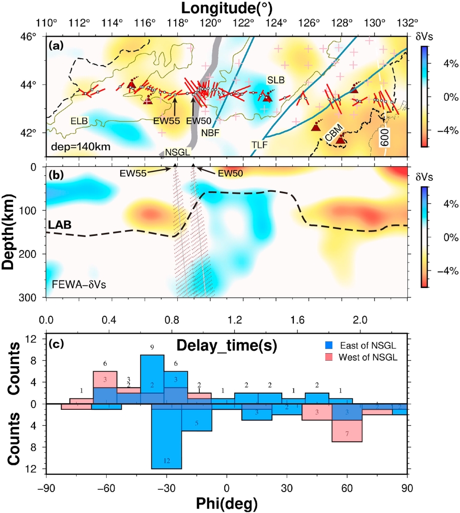 圖2 (a)利用SIMW方法獲得的剪切波分裂結(jié)果;(b)沿著臺陣所在測線(~43.5°N)的S波速度異常圖;(c)以南北重力梯度帶(118.5°E)為界東西兩側(cè)的快軸方向和延遲時間的統(tǒng)計直方圖