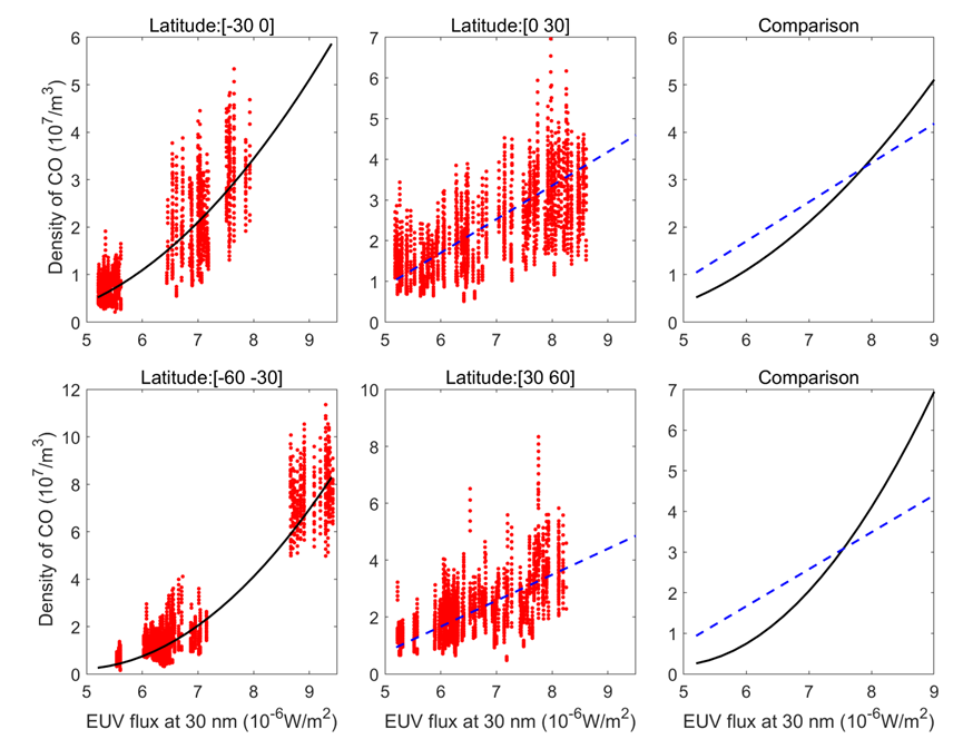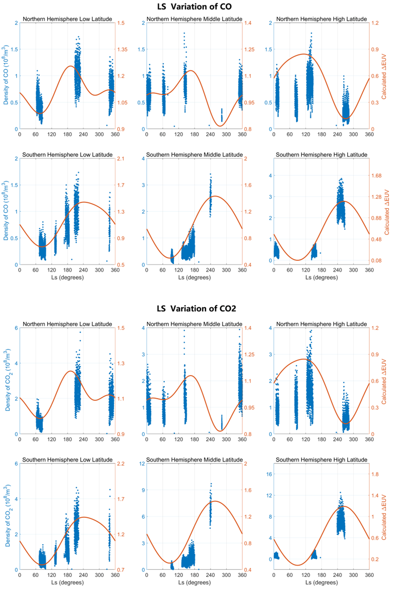 他們根據(jù)太陽天頂角及火星到太陽距離的計算,發(fā)現(xiàn):太陽EUV通量的季節(jié)變化最強出現(xiàn)在南半球高緯度地區(qū),最弱出現(xiàn)在北半球低緯度地區(qū)。CO與CO2密度具有相同的變化特征(圖1)。觀測和模擬計算均表明,南半球的季節(jié)變化比北半球更顯著,因為火星到太陽的距離和太陽天頂角對太陽EUV通量的影響在南半球方向相同,但在北半球方向相反。