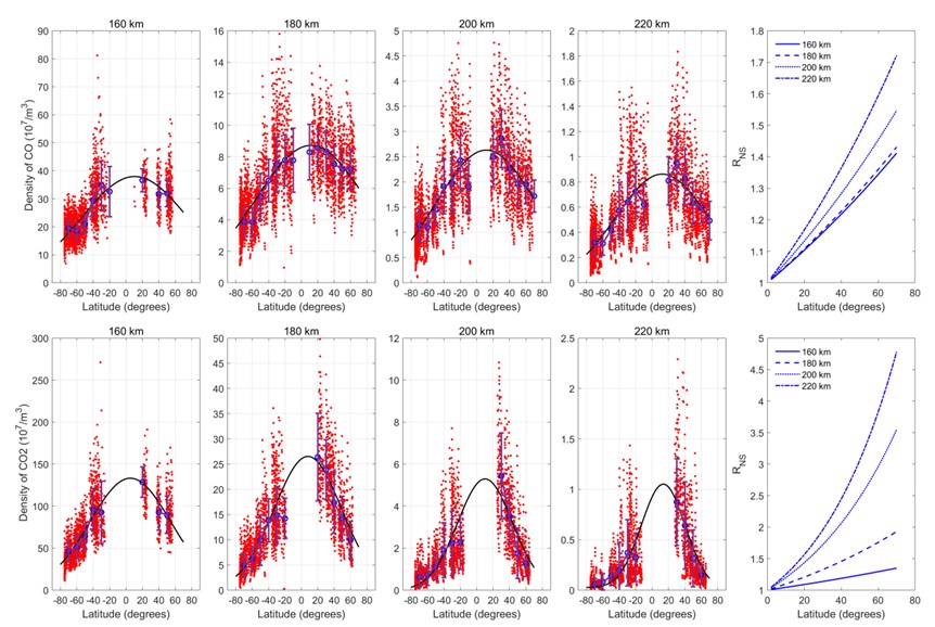 圖2 熱層CO與CO2密度在不同高度的緯度結構