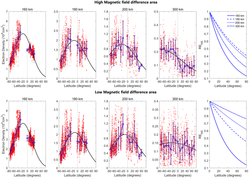 此外,他們分析了太陽活動較強時期(2014-2015)的觀測數(shù)據(jù),結果也顯示出顯著的南北不對稱,但北半球的中性密度低于南半球。也就是說,高層大氣南北半球之間的差異在不同太陽活動期間有顯著差異。圖3給出了熱層大氣密度南北半球不對稱性隨太陽輻射的變化。他們還統(tǒng)計分析了電離層電子密度的南北半球不對稱性,結果表明,與熱層中性大氣密度半球不對稱性一樣,電離層電子密度的半球不對稱性也有顯著的太陽活動依賴性,在較低太陽活動條件下,北半球電子密度大于南半球,隨著太陽輻射增加,南半球電子密度逐漸超過北半球。但是,電離層電子密度與熱層中性大氣密度半球不對稱的轉(zhuǎn)換閾值有差別,具體原因有待進一步研究。