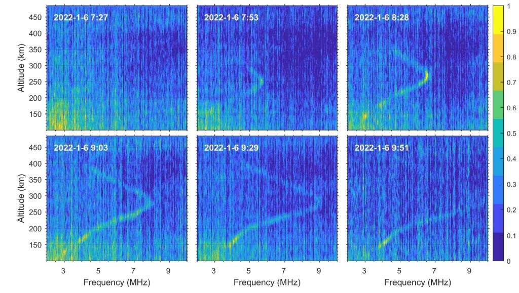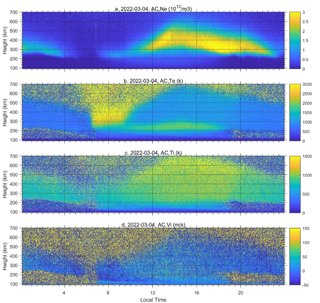項目驗收后,中國科學(xué)院地質(zhì)與地球物理研究所樂新安研究員等人采用不同工作模式對我國低緯電離層開展觀測研究,發(fā)展了多種數(shù)據(jù)處理和分析方法,特別是從2022年開始,SYISR進(jìn)行長期連續(xù)運行,獲得了高精度、長時間的電離層剖面監(jiān)測(圖4)。隨著SYISR探測數(shù)據(jù)的積累,相關(guān)的科學(xué)研究工作也正在逐步展開。