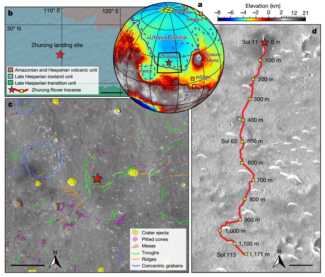 圖1祝融著陸區(qū)地質(zhì)地貌圖。(a)祝融號、鳳凰號、洞察號、好奇號、毅力號和海盜號著陸點位置及古海岸線位置;(b)祝融號著陸點附近的簡化地質(zhì)圖,比例尺為200千米;(c)祝融號著陸點附近的地形地貌圖,比例尺為15千米;(d)祝融號行駛路徑圖,比例尺為100米