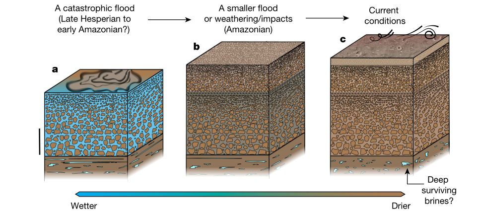 圖3烏托邦平原南部火表改造模型圖。(a)晚西方紀(jì)至早亞馬遜紀(jì)發(fā)生了大型洪水事件,隨著洪水消退,形成了向上變細(xì)的礫巖沉積序列,比例尺為20米;(b)亞馬遜紀(jì)短時洪水、長期風(fēng)化或重復(fù)撞擊作用改造了火表,形成了由小石塊堆疊構(gòu)成的向上變細(xì)的沉積層序;(c)近代火星高傾角自轉(zhuǎn)導(dǎo)致液態(tài)水流失到高緯地區(qū),形成現(xiàn)今干燥的火壤層,火表以風(fēng)成沉積和侵蝕過程為主