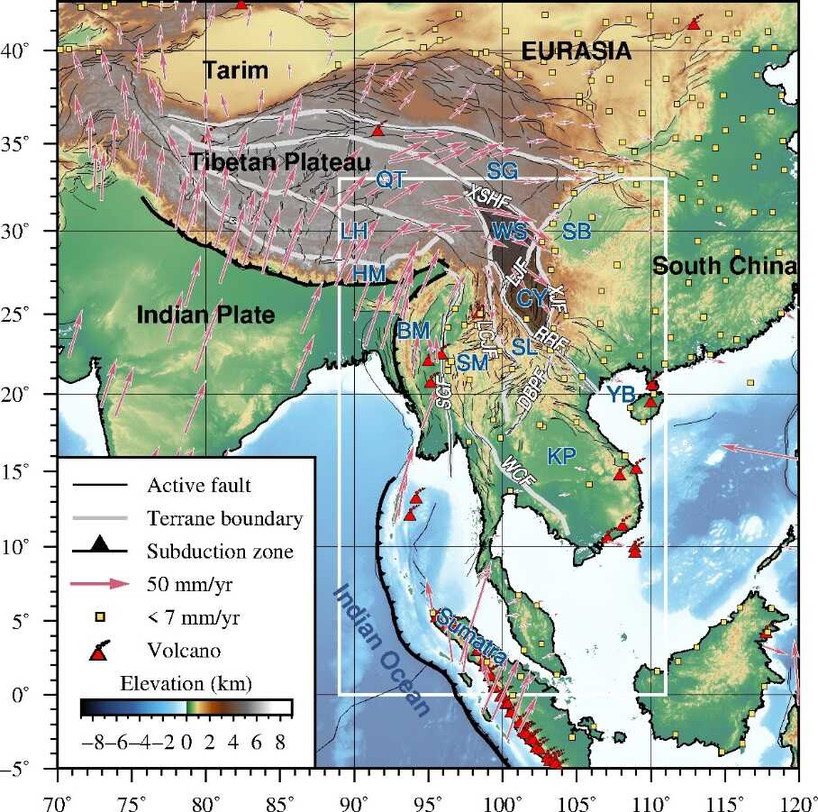 圖1 青藏高原和中南半島地區(qū)地形圖?;顒?dòng)斷裂分布和地塊邊界分別用黑色細(xì)線和灰色粗線表示。圖中標(biāo)出了主要斷層(XSHF,鮮水河斷裂;LJF,麗江斷裂;XJF,小江斷裂;LCJF瀾滄江斷裂;DBPF,奠邊府?dāng)嗔?;WCF,王朝斷裂;SGF,實(shí)皆斷裂)和地質(zhì)塊體單元(QT,羌塘塊體;SG,松潘甘孜塊體;LH,拉薩塊體;WS,川西塊體;SB,四川盆地;HM,喜馬拉雅塊體;CY,滇中塊體;BM緬甸塊體;SM,滇緬泰塊體;SL,思茅蘭坪塊體;YB,鶯歌海盆地;KP,呵叻高原)、全新世火山(紅色火山符號(hào))、GPS水平運(yùn)動(dòng)方向和速度值(紅色箭頭)和相對穩(wěn)定的觀測速度值小于7 mm/yr的GPS臺(tái)站(淡黃色方塊)。