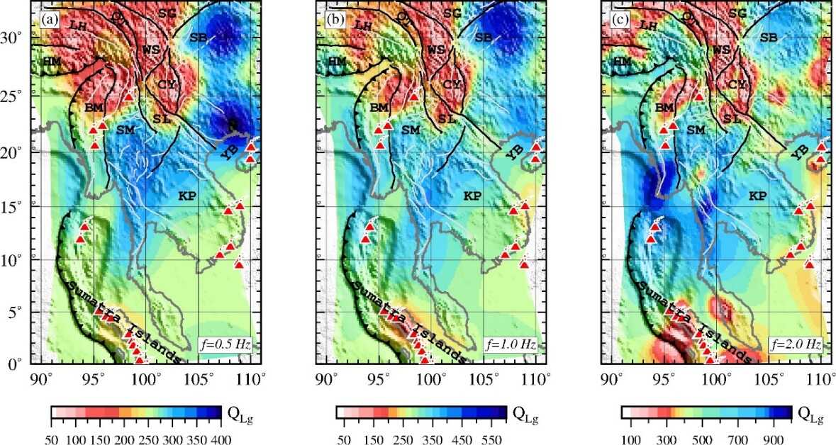 圖2 (a) 1.0 Hz、 (b) 2.0 Hz和 (c) 3.0 Hz的Lg波Q值分布圖。圖中還標(biāo)出了主要斷層(黑色線條)、斷層展布(灰色線條)和全新世火山(紅色火山符號(hào))。地質(zhì)構(gòu)造單元的縮寫名稱參見圖1。