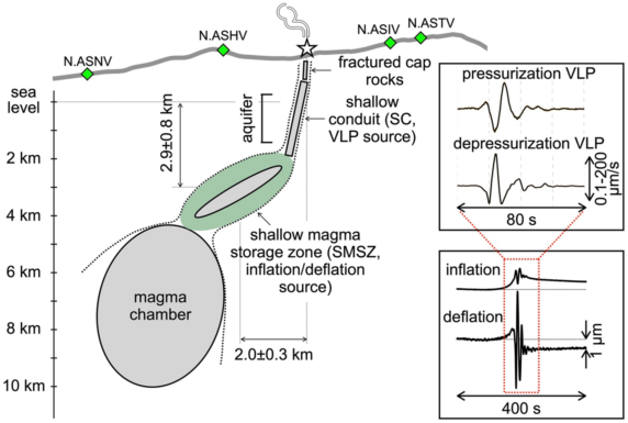 圖 1 日本阿蘇火山內(nèi)巖漿供應系統(tǒng)的東西剖面。左:淺部裂縫巖漿管道(SC)和巖漿房頂?shù)臏\部巖漿儲藏區(qū)域(SMSZ)。右上:超長周期震顫事件(VLP);右下:形變事件。
