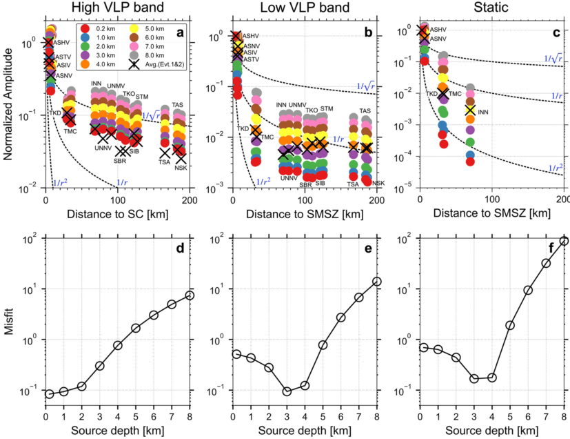 圖 2 不同頻帶波形振幅隨著震中距的衰減趨勢與不同深度爆炸源的理論預測值的比較。(a)高VLP頻帶(0.03-0.07 Hz)的振幅衰減;(b)低VLP頻帶(0.01-0.02 Hz)的振幅衰減;(c)永久位移的衰減;(d)-(f)不同深度爆炸源理論預測值與相應頻帶觀測值的均方根殘差。