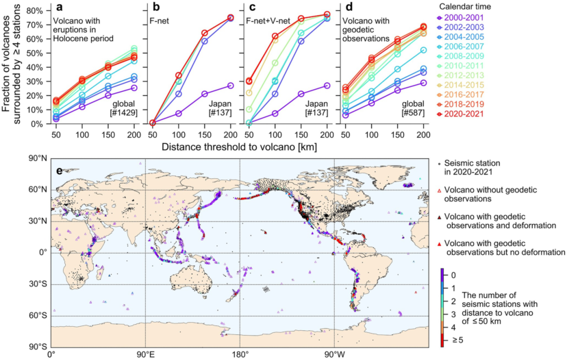 圖 3 重復性火山地震事件全球分析圖。(a)在給定距離具有4臺以上地震臺站的全球全新世火山百分比;(b)在給定距離具有4臺以上F-net臺站的日本活火山百分比;(c)在給定距離具有4臺以上F-net和V-net臺站的日本活火山百分比;(d)在給定距離具有4臺以上地震臺站的擁有大地測量觀測的全球全新世火山百分比;(d)2020-2021年度在50公里內(nèi)具有不同數(shù)目地震臺站的全新世火山的空間分布。