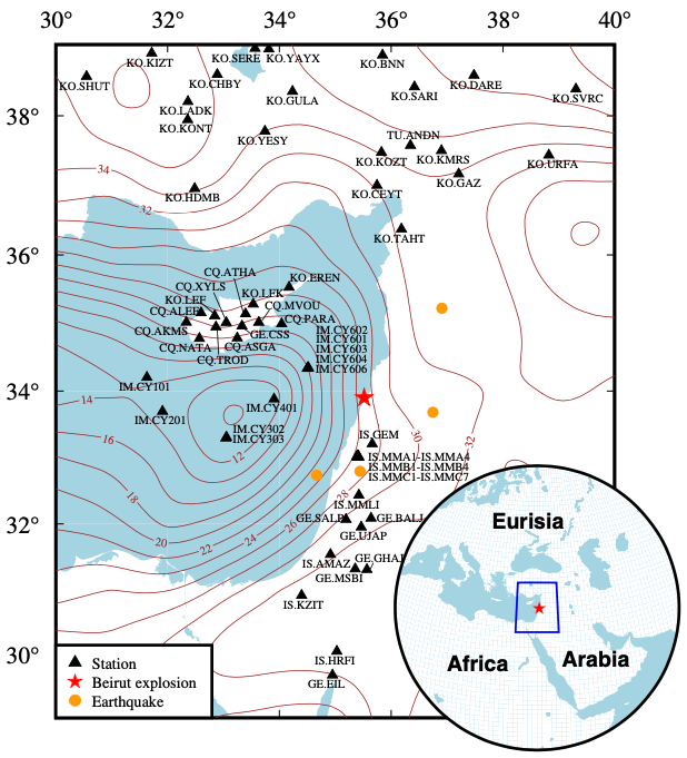圖1 黎巴嫩及周邊地區(qū)地圖,其中包括貝魯特爆炸爆心位置(紅色五角星)、鄰近的4次天然地震(橙色圓)和研究中使用的寬頻帶地震臺(tái)站的位置(黑色三角形)。右下角小圖顯示了研究區(qū)域的地理位置。