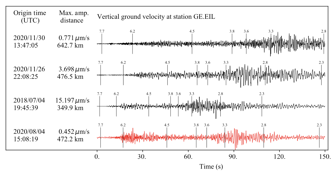 圖2 貝魯特化學(xué)爆炸(紅色)與天然地震(黑色)在GE.EIL臺(tái)站記錄到的垂直分量速度波形的特征。