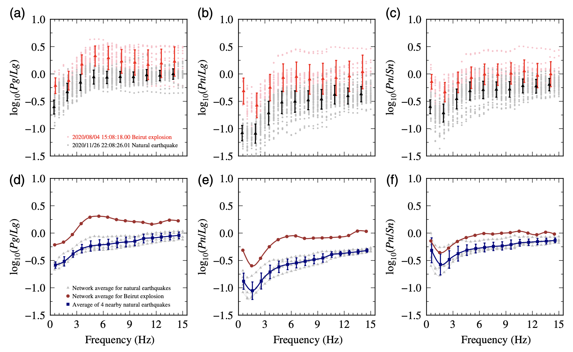圖4 貝魯特爆炸以及鄰近4個(gè)天然地震的區(qū)域震相譜比值Pg/Lg、Pn/Lg和Pn/Sn的比較。(a)-(c)貝魯特爆炸(紅色)與發(fā)生在2020年11月26日一個(gè)天然地震(黑色)單臺(tái)觀測譜比值和臺(tái)網(wǎng)平均譜比值的對比。(d)-(f)貝魯特爆炸與4個(gè)地震事件的臺(tái)網(wǎng)平均譜比值。