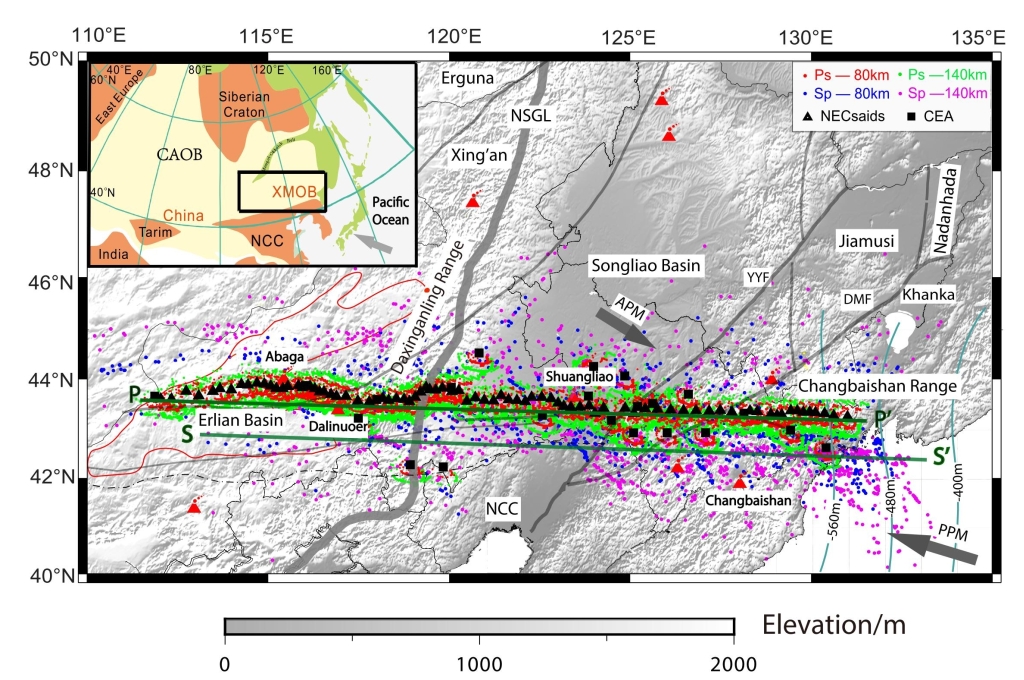 圖1 興蒙造山帶構(gòu)造劃分、本研究使用的地震臺站分布及接收函數(shù)Ps 和Sp穿透點位置分布圖。左上角插圖為大區(qū)域構(gòu)造簡圖;PPM—太平洋板塊的絕對運動方向;APM—歐亞板塊的絕對運動方向;NSGL—南北重力梯度帶;YYF—依蘭-伊通斷裂;DMF—敦化-密山斷裂;NCC—華北克拉通