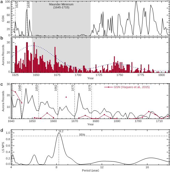 中國科學院地質(zhì)與地球物理研究所閆麗梅副研究員、何飛研究員、樂新安研究員聯(lián)合北京大學田暉教授、何建森教授、宗秋剛教授、山東大學夏利東教授,通過對古赤道極光數(shù)據(jù)庫的分析研究,證實古赤道極光記錄可以表征太陽活動變化,并發(fā)現(xiàn)蒙德極小期期間太陽活動變化~8年周期占主導,這表明太陽發(fā)電機在超級極小期可能進入了一個獨特的發(fā)電機模式。